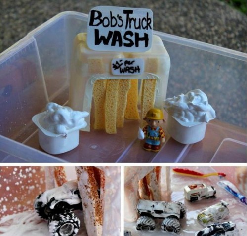 Если ребенок не вылезает из ванны, можно предложить ему мойку для машинок. Из пластикового контейнера делается сама автомойка, а валики заменяются полосками из моющей губки. Вместо мыла лучше взять пену для бритья, чтобы процедура была интереснее.