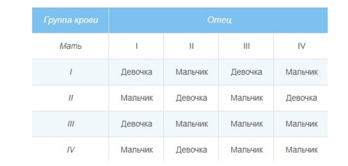 Существует мнение, что группа крови супругов влияет на пол будущего ребенка. В таблице, которая приведена ниже, вы можете ознакомиться с тем, какого малыша в будущем стоит ждать паре.