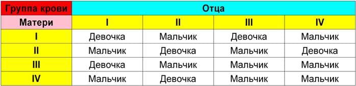 Предлагаем вам ознакомиться с таблицей, на которой показано, какого пола ребенок родится у мужчины и женщины с определенной группой крови.