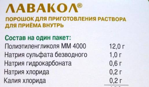 Лавакол в качестве главного компонента имеет макрогол. На его долю приходится 12 г. Оставшийся процент массы — дополнительные вещества:
