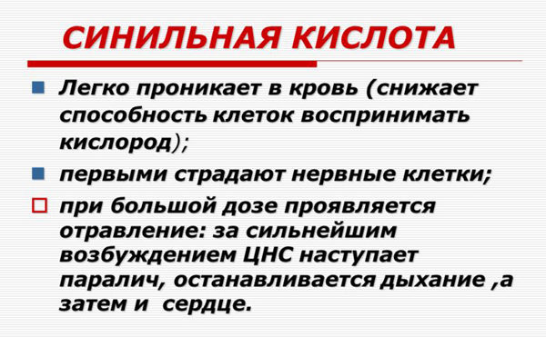 Если не соблюдать технику безопасности при работе с синильной кислотой, очень высок риск получения отравления цианидами – химическими веществами, в составе которых специфический азотно-углеродный комплекс. Синильная кислота как раз и содержит эти цианистые соединения.
