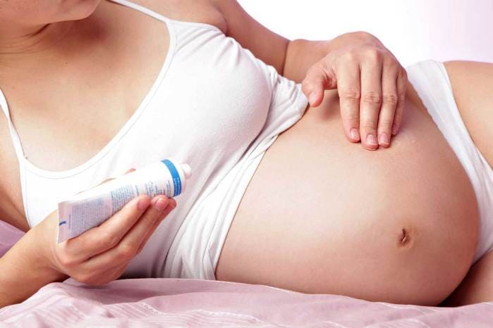 - Со второго месяца беременности начинайте применять специальные уходовые крема и масла для беременных, которые в большом количестве продаются в аптеках. Если у вас нет желания пользоваться такой косметикой, то используйте вместо крема оливковое масло.