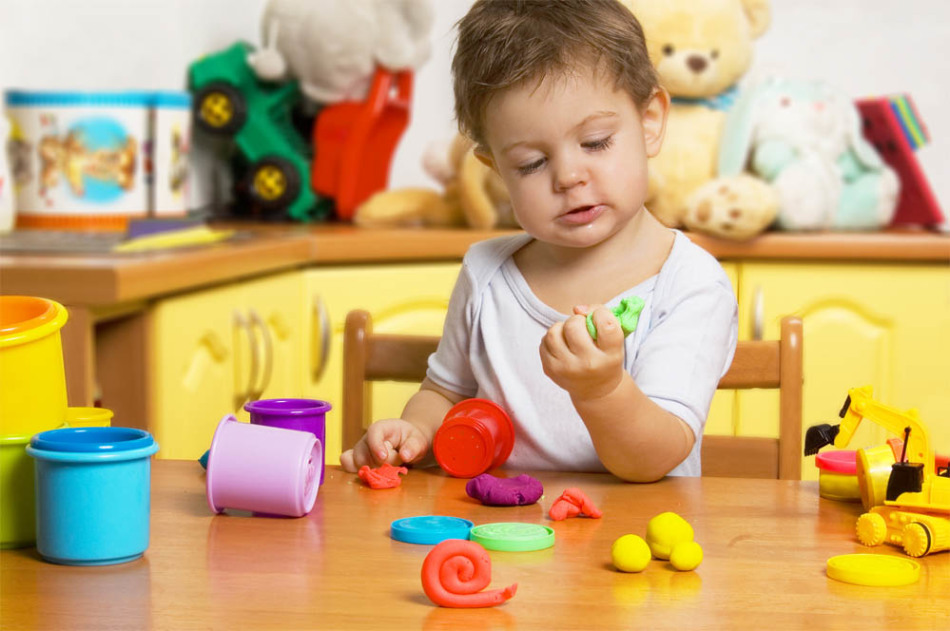 - Прекрасно развивает мелкую моторику лепка. Приготовьте соленое тесто – оно полностью безопасно, даже если малыш попытается взять его в рот, или купите специальную пластичную массу разных цветов. Лепите вместе шарики, тарелочки, жгутики. Покажите малышу, как раскатывать колбаски, резать их пластмассовым ножичком