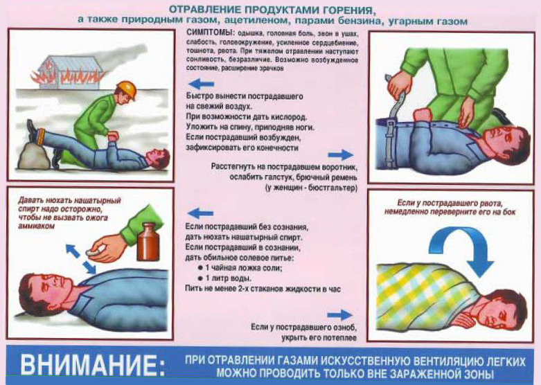 Интересно!Если причины отравления в пребывании в месте сильного пожара, к симптомам могут прибавиться удушье от дыма, ожоги кожи и легких. Тогда потребуется помощь специалиста, у которого будут оборудование для искусственной вентиляции, подачи кислорода, противошоковые препараты.