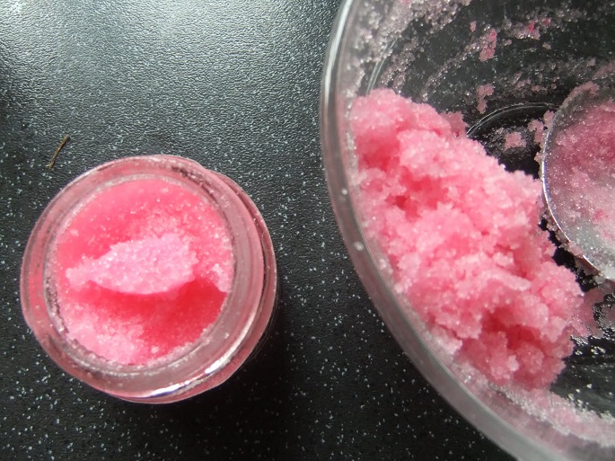 - Добавить туда несколько капель обычной воды и хорошо перемешать. Должен получиться густой домашний скраб для губ.